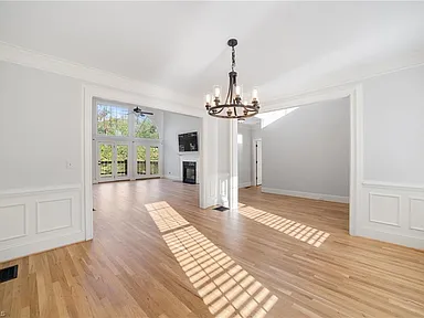 From the moment you step inside, you’re greeted with refinished hardwood floors, soaring ceilings, and an abundance of windows that fill the home with sunlight. The two-story great room is the centerpiece of the main level, creating a dramatic yet cozy atmosphere that seamlessly connects to the formal dining room and the eat-in kitchen.