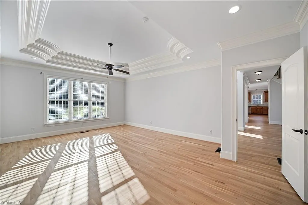 Main-Level Primary Suite with dual walk-in closets and tray ceiling