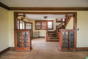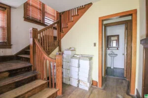 The grand staircase greets visitors immediately upon entry—a centerpiece of finely carved wood that captures the eye and hints at the home’s original sophistication.