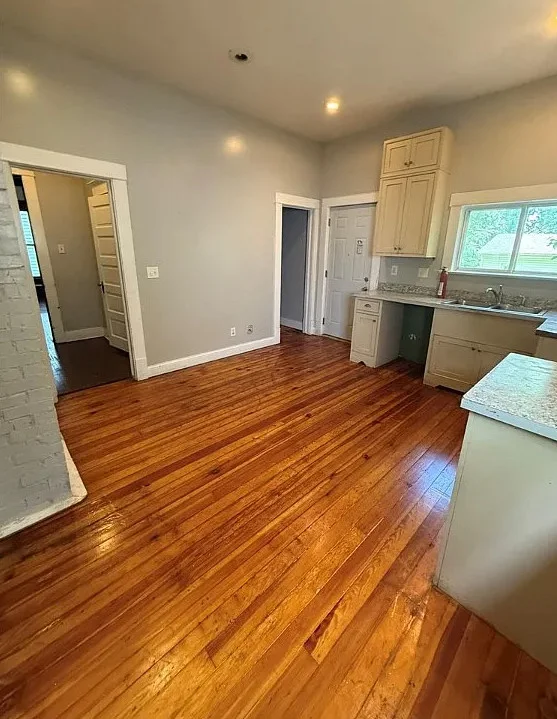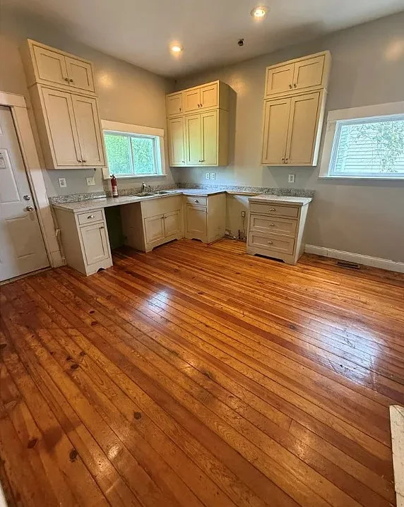 The generously sized kitchen is full of potential, offering plenty of space for an island, additional cabinetry, or a cozy breakfast nook.