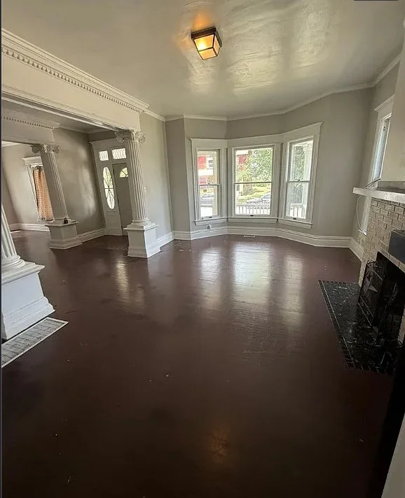 Tall baseboards and finely detailed crown moulding line the walls, while bay windows allow sunlight to pour in, casting a warm glow across the spacious interiors.